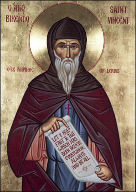 Vincent écrit que « la foi pure se munit, avec l’aide du Seigneur, de l’autorité de la loi divine et de la tradition de l’Eglise catholique[1], contre les pièges des hérétiques… Dans l’Eglise catholique, il faut tenir avec le plus grand soin ce qui a été cru partout, ce qui a été cru toujours, et ce qui a été cru par tous. [2] Ceci est en effet vraiment et proprement catholique… Or nous suivons l’antiquité, si nous ne nous détachons pas des sens que nos maîtres et pères ont manifestement célébrés ; nous suivons aussi ce même consentement, si, dans cette même ancienneté, nous suivons toutes les sentences et les définitions de tous ou de presque tous les évêques ou docteurs… »
