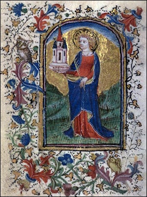 On la représente souvent avec une tour et un ciboire surmonté d’une hostie, mais aussi avec une plume, ou encore en piétinant un Sarrasin.